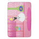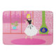 Retro i Rosa Bath Mat ser ut som en scen ut ur en romantisk komedi från 1960. Den minimalistiska designen visar en sofistikerad kvinna i hennes ultrakitschi och ultrarosa, penthouse-lägenhet. Rummet har en rosa tegelvägg med vit linjer. Framför väggen finns det en grönt konkamera med en brinnande brand. Genom att skjuta glasdörrar ser vi en rosa balkong med en vit rälsförhöjning. En lush, tropisk växt ligger i en vattenbrunn. Balkongans vy är av en silhuett av en stor stadskylin. Det är klart att silhuetten är i rosans nyck! En gult, ett halvmåne måne ligger i himlar. Att stå på en shock rosa är att matta i lägenheten är det främsta dam i denna konstruktion. I skarp kontrast till den rosa värld hon har skapat har den vackra blondinen en formpassning, en svart, skophalsad överdel med en lång, flammande, vit kjolt med svartludd. Med den här designen kan du också tittar dig på jorden med ro färgad-glasögon!