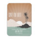 En vintage inspirerade spara datum magneter till ett badbröllop på stranden med en illustration av två handflatan träd på en ö omgiven av havet med solnedgång och moln vid horisonten. Anpassa den vita texten med detaljer om tillfälle.