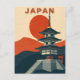 Immerse yourself in the tranquility of the East with this stunning Japan Travel Postcard. This vintage-style design features a majestic multi-tiered pagoda and a traditional Torii gate, set against a massive, bold red sun.