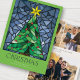 De här klara och färgstarka 5-tums x 7-tums platta julhälsningskorten har en handgjord glasruta av nedfläckad med vattenfärg från grönt Julgran med guld-stjärna och röda prydnadsföremål som är inramade i blå nyanser på gröntens papegojbakgrund. Hälsning är "jul" i ett stort dekorativt brev med ett redigerbart hälsning, "önskar dig fred, kärlek och glädje denna julhelg". Kortets baksida har en plats för tre av dina favoritfoton med platshållare för ditt namn och år.