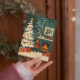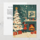 Ge julvärmen och nostalgin från en gammal tid tillbaka med detta charmiga retro julkort. Med en förtjusande illustration av en ung flicka som dekorerar vid en mysig öppen spis fångar scenen essensen av en klassisk julfirande med ett snötäckt julgran, inslagna presenter och tindrande stjärnor. Mid-century-stilen och de rika, festliga färgerna frammanar en känsla av tidlös glädje, vilket gör detta kort perfekt för att skicka hjärtliga hälsningar till nära och kära. Baksidan innehåller en meddelandemall för enkel anpassning eller en handskriven anteckning, vilket ger en personlig touch till dina julönskningar.