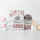 "Kära Santa, exakt hur BRA måste jag vara?" Charming Retro-estetiskt 50-talets 60-årsjubileum pappert med en skör Jultomten-svart och vit design. Typografin är röd över en mjuk vit bakgrund och grått-träbakgrund Denna design var grafiskt designad av en internationellt licensierad konstnär och formgivare, Audrey Jeanne Roberts, upphovsrätt.