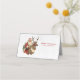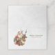 Liten vik platskort med en roligt julillustration. Jultomten i sitt traditionella röda kostym rider en stor, skrynklig renar som dekoreras med holly. En Julgran i baksidan.