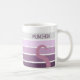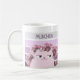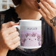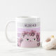 Pigglig, söt, vintage, retro blommande lila mugg med kawaii-katt, färgglada ränder, blommor och anpassat smeknamn.