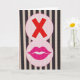 This design shows a tall figure-eight shape running down the center of the card. In the top loop, there’s a strong red “X” that looks crisp and simple. In the bottom loop, a pair of hot pink lips sit slightly open, with small white highlights that make them look glossy. A pale pink outline traces the center shape, and behind it are vertical stripes that alternate black and creamy beige. The whole image has a pixel-like texture, like you’re seeing it on a screen, which gives it a modern, digital feel. There isn’t any other written message on the front besides the red “X,” placed in the upper section. It feels meaningful because it captures that mix of being nervous to speak up and still wanting to show affection, which can be very real in love or friendship 🥰❤️. Hope it helps you share your Valentine’s Day sentiments.