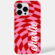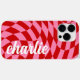 Telefonväska med rosa och rött, tvinnat schackbräde mönster och ditt namn i ett vitt, reflex stil-teckensnitt.