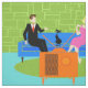 Detta Retro kopplar ihop med katttygsärdrag som en tecknad kopplar ihop pröva för att få den hållande ögonen på televisionen för mysigt stunder på ett mitt- århundrade modern, blåttsoffa. Katten, har emellertid andra idéer. På en sida av soffan finns det en stilig man i en svart kostym med den röda tien. På andra sidan av den stilfulla soffan finns det en härlig blond kvinna i en passande bilda, shock rosa klär. Saker skulle går utmärkt, om den inte var för den släta svart katten, som har lagt fordrar till centrerasoffan dämpar. Denna 60-talstil, den minimalist konstdesignen är fastställd i ett stilfullt vardagsrum. Soffa bakgrund är en grönt, stenvägg. På aquagolv finns det en runda, den gröna shagmattan, som matchar stenväggen. På förgrunden av designen ser vi baksidaen av en orange televisionuppsättning med kaninöron, som verkar för att leka katt det favorit- TVprogramet.