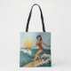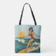 Denna soliga surf-tema tote är den perfekta strandväskan och ett bra sätt att bära dina dagliga nödvändigheter. Den retroinspirerade konsten visar en surfande pinup-modell som rider på en ändlös våg under den blå himlen och den strålande solen. Designad med gammaldags kalifornisk energi, ger det slitna utseendet den en autentisk känsla, som om den vore hämtad direkt från en vintage surfbutik. Visa upp din kärlek till vågorna med denna roliga toteväska.