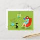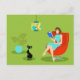 Denna Retro läs- kvinnavykort presenterar en 60-talstil, minimalist konst, tecknadteckning av en kvinna som har henne prioriteter in att beställa. Denna ljuva bokmal hänryckas i en verklig sida-turner. Den välformade brunetten ha på sig en aquaklänning, och röda exponeringsglas, fördriver innehav en blåttbok. Hon placeras i en comfy röd äggstol. Framme av henne, förser med krage en slät svart katt i en kricka tycker om freden och tystnaden som kommer från uppehälle med en bibliofil. Både kvinnan och katten är i ett stilfullt grönt rum. Över huvudet finns det en kitschy hängelampa skuggar in av gult och turkos. Till sidan finns det en frodig, tropisk inlagd växt i en aquablomkruka. Kattunge om du behöver något, ska du måste väntan, tills hon avslutar detta kapitel!
