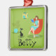 Det här Anpassadet Retro Reading Woman jul Ornament har en stil, minimalistisk konst från 1960, tecknad teckning av en kvinna som har ordning på sina prioriteringar. Den här beundransvärda bokmasken finns i en riktig turner. Den formliga brunetten bär en akvatisk klänning och röda glasögon, medan den håller en blå bok. Hon sitter i en komfyr, röd äggstol. Framför henne njuter en slimmad, svart katt i en tealkrage av den fred och tystnad som kommer från att leva med en bibliofil. Både kvinna och katt är i ett rum för snyggt grönt. Det finns en kitschy pendant-lampa i gult- och turkoshallar. På sidan finns det en buskplanta, tropisk, krukplanta i en vattenkruka. Kattunge, om du behöver något, måste du vänta tills hon avslutar det här kapitlet! Anpassa för en gåva.