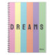 Retro Lodrät rand Dreams egna namnanteckningsbok.perfekt-gåva till älskare eller någon speciell som förtjänar speciella anteckningar.En snyggt färgblock bärbar dator med 6 lodrät rand med texten "Dreams" i skuggor av rosa, persika, lila, gult och grönt i en modern mininmalisk design stil. Det är enkelt att anpassa texten med ditt namn eller din titel för den perfekta presentationen eller tillägget till personligen.