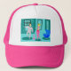 Den här Retro Magic Genie-Truckerkepsen är som en drömsann kom! 1960-talet stil, minimalistiskt, tecknad teckning, visar insida i mitten av århundradet ett modernt hus med teal- och turkosnötväggar och golvbeläggning. Vi ser en vacker, blond, genie som bär en shock rosa, bikini top och gasväv, harem byxor. Med en sån figur är hon inte din vanliga, vardagliga genie! Vid golv, bredvid henne, ser vi hennes ornate Genie flaska, som har tjänat som hennes hem i joner. På motsatt sida om flaska finns det en stilig astronaut som verkar ha kommit till scenen med magi. Han bär grått rymden kostym och håller sin astronaut hjälm under ett arm. Det ser ut som om befälhavaren har liten kontroll över sin genie's actions! På brickens accentmur bakom honom finns det en Modern Canvas Wall Art från Strange Little Onions egen Zazzle-butik som bevisar att de har en oklanderlig smak! I designens hörn finns en ljusblå äggstol som skulle vara höger hemma i vilken klassisk TV-port som helst från 1960. Ordna idag och du har allt du någonsin önskat dig! Du har allt du någonsin önskat dig, om allt du någonsin önskat är en Retro Magic Genie-design.