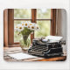 Gammalmodig manuell skrivmaskin med daisy bouquet på skrivbordet med soligt fönster