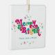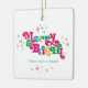 De här 2,75-tums x 2,75-tums fyrkantiga keramiska prydnadsämnena har en ljusstark och färgstark hälsning, "Merry & Bright," i magenta, grönt, blått och guld med platshållare för din familj namn(er) och år. Lägg till ditt favoritfoto på baksidan!