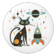 Roligt keramisk knopp med en retro MCM-design med en svart katt, turkos ögon, stjärnor, rymdskepp och planet Saturn.