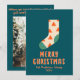 Om man tittar sig för ett enkelt, minimalistiskt, vackert och lätt redigerbart julkort. Den här är perfekt för dig. Och när du ser designen har du en vintage krämbeige och röd och grönt vinterstrumpa med beige och röd handstil i GOD JUL. Och din familj namn och året under den. Och i baksätet har du ett anpassade i julparet hälsning och familjefoto. Allt på blå bakgrund. Så gör julen i hälsning enkel och ändå unik och varm.