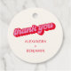 Denna runda rosa och röda etikett med "tack"-tema har fet, lekfull bokstavsstil i kombination med ren personlig text för ett utseende som känns modernt, roligt och genomtänkt. Den varma neutrala bakgrunden håller den mångsidig, medan färgspråket ger personlighet. Personliga namn gör det enkelt att knyta an till er evenemangdetaljer samtidigt som designen hålls enkel och polerad. Perfekt som presenter vid bröllop, bröllopsdagsfester, förlovningsfester, välkomstpresenter eller små tack-moment under firandet.