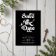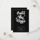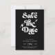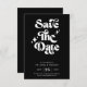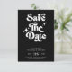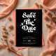 Det här moderna bröllop spara datum-kortet kombinerar vintage charm med modernt flair. Den här designen har ett djärvt, groovy-skript på en slimmad svart bakgrund och skapar ett meddelande om tidslängd och snyggt för din speciella dag. Perfekt för återinspirerat bröllop anger tonen för en chic och ett minnesvärt firande.