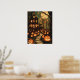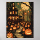 The pathway lined with pumpkins creates a mysterious Halloween atmosphere with a haunted house surrounded by jack-o’-lanterns under a bright full moon.