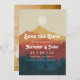 Ett meddelande från trendig bröllop spara datum om ert kommande berg- eller skogsområde bröllop. Den här designen innehåller en undermålig illustration av ett berg- och skogslandskap i gult, orange och marint blått, som är övertäckt med dina bröllop-detaljer i ett vitt reflexteckensnitt. Lägg till ditt favoritfoto på motsatt sida.
