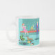 Det här Retro-paret med Hund Frosted Glass Mugg ser ut som en scen ut ur en romantisk komedi. 1960-talets stil, minimalistiska konstdesign, har ett attraktivt par som njuter av en romantisk kväll hemma. Det sofistikerade rummet har en framträdande plats i ett akva- och tealtegelstav med en ljusröd ledtråd. En vacker, rödhårig kvinna som bär en rosa klänning är upptagen på åsen. Hon njuter av en martini med en flytande oliver, en häftig brand, bra musik och företaget en lång, mörk och stilig man. Mannen bär blå kostym och röd slips. Hans martinisglas är upphöjt för att skaka hans charmerande sällskap. I sin andra hand håller han ett vinylskivalbum. På hans fötter ser vi en skicklig dachshund som bär en röd hals. Hund som spelar torkar går i riktning mot en inspelningsspelare för grönt med orange, spindle ben. På golv finns det en färgstark grupp av roligt, eclectiska, vinylregister. Skål! Här är perfektens kväll hemma.