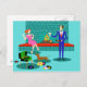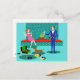 Det här Retro-paret med Hund-vykort ser ut som en scen ut ur en romantisk komedi. 1960-talets stil, minimalistiska konstdesign, har ett attraktivt par som njuter av en romantisk kväll hemma. Det sofistikerade rummet har en framträdande plats i ett akva- och tealtegelstav med en ljusröd ledtråd. En vacker, rödhårig kvinna som bär en rosa klänning är upptagen på åsen. Hon njuter av en martini med en flytande oliver, en häftig brand, bra musik och företaget en lång, mörk och stilig man. Mannen bär blå kostym och röd slips. Hans martinisglas är upphöjt för att skaka hans charmerande följeslagare. I sin andra hand håller han ett vinylskivalbum. På hans fötter ser vi en skicklig dachshund som bär en röd hals. Hund som spelar torkar går i riktning mot en inspelningsspelare för grönt med orange, spindle ben. På golv finns det en färgstark grupp av roligt, eclectiska, vinylregister. Skål! Här är perfektens kväll hemma.