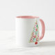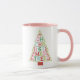 Den här lekande mugg har ordspråket "Oh Julgran" med alternerande färg på gemener i brev med gnistra accents. Färg omfattar rosa, rött, grönt och ljusblått.