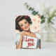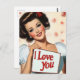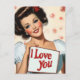 En levande illustration i klassiska stil på 1950-talet. Bilden innehåller en glamorös kvinna med vintage, fet makeup och ett strålande leende. Hon har en skylt med ett kärleksfullt budskap, "I Kärlek You", mot bakgrund av ett känsligt rosa ros. Den totala estetiska bilden fångar den romantiska och lekfulla vibden av halvsekelstift-up-konst.