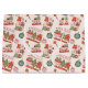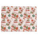 A lively pink, green, and red 70's retro pattern with the joys of Christmas, including ornaments, presents, and pine trees,