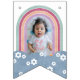 Den här buntbanderollen är skapat för att koordinera med "Retro Rainbow"-inbjudningssviten för födelsedlarna och har en färgstark regnbåge och molndesign med en handfull daisy spridda runt. "Grattis på födelsedagen"-meddelandet skrivs i ett återinspirerat teckensnitt och placeras över en diagonal mönster-bakgrund. Det finns utrymme för ett foto på regnbågspanelerna, eller så kan fotot tas bort. Medan den här buntbanderollen skapades för ett barns födelsedagsfest, så skulle det vara perfekt för en babydusch också.
