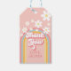 Tack! Retro inspirerade till födelsedagstaggar med 70 stil typsnitt och färg, regnbåge och daisy i rosa