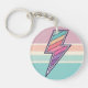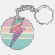 Denna iögonfallande nyckelring har en djärv blixt som är fylld med ett groovy, retro-inspirerat solnedgångsrandigt mönster. Designen kombinerar en kraftfull symbol med en mjuk, vintage-inspirerad färgpalett, allt inom en cirkulär ram med en subtil prickig textur.