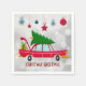 Pappra blöjor med en coola gammal röd bil som bär en grönt christmas gräs träd på tak och en present som är inkapslad i den öppna bäckenet. Har en underbar retro 50 stil flair. Julen bollar, snöflingor och stjärnor gick uppifrån. Sätt på en silver-bänkbakgrund med snyggtens stjärnor spridda runt.