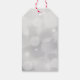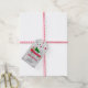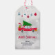Juletiketter med en coola gammal röd bil som bär en grönt christmas gräs träd på tak och en present som är inkapslad i den öppna bagageutrymmet. Julen bollar, snöflingor och stjärnor gick uppifrån. Sätt på en silver-bänkbakgrund med snyggtens stjärnor spridda runt. Har en underbar retro 50 stil flair.