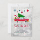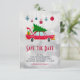 Julen sparar datumkortet med en coola gammal röd bil som bär en grönt christmas gräs träd på tak och en present som är inkapslad i den öppna bagageluckan. Julen bollar, snöflingor och stjärnor gick uppifrån. Sätt på en silver-bänkbakgrund med snyggtens stjärnor spridda runt. Har en underbar retro 50 stil flair.