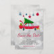Julen sparar datumkortet med en coola gammal röd bil som bär en grönt christmas gräs träd på tak och en present som är inkapslad i den öppna bagageluckan. Julen bollar, snöflingor och stjärnor gick uppifrån. Sätt på en silver-bänkbakgrund med snyggtens stjärnor spridda runt. Har en underbar retro 50 stil flair.