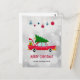 Julvykort med en coola gammal röd bil som bär en grönt jultoma gräs träd på tak och en present som är inkapslad i den öppna bagagehytten. Julen bollar, snöflingor och stjärnor gick uppifrån. Sätt på en silver-bänkbakgrund med snyggtens stjärnor spridda runt. Har en underbar retro 50 stil flair.