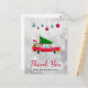 Tack för vykortet med en coola gammal röd bil som bär en grönt christmas gräs träd på tak och en present som stuckits bort i den öppna bagageluckan. Julen bollar, snöflingor och stjärnor gick uppifrån. Sätt på en silver-bänkbakgrund med snyggtens stjärnor spridda runt. Har en underbar retro 50 stil flair.