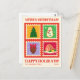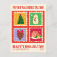 Det här julkortet har julklapp frimärke med snögubbe, Julgran, pinecon, skinka bilder och retrotypografi av Helgdag och Glad helg. Anpassa den med ditt namn och år.