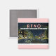 Vintage vykort illustration av Reno på natten. Färgad ljus och gamla bilar med rosa nybilstecknet "Reno" överst med "Världens största lilla stad" i vitt nedan. Det är en scen från Virginia Street i Reno.