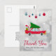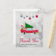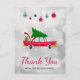 Tack-kort med en cool gammal röd bil som bär en grön julgran på taket och en present inklämd i den öppna bagageluckan.