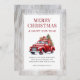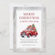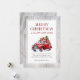 Rustik julkort med en gammal röd lastbil som bär ett julgran och presenter i en rustik träram. Personalisera enkelt detta röda lastbils-julkort med ditt familjenamn och text.