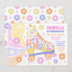 En roligt- och ljusreflexinspirerad rullskriddesign i färg-palettens rosa, orange, lila och gult. På framsidan finns ett vitt rullskridskor med texten "Låt oss rulla" i ett reflexskript med en regnbåge som brinner bakom, och på baksidan finns en roligt ljusa mönster av återblommor. Anpassa informationen till party! Se hela matchande party-samling.