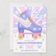 En roligt- och ljusreflexinspirerad rullskriddesign i färg-palettens rosa, orange, lila och gult. På framsidan finns ett lila rullskridskor och texten "Låt oss rullskript" i ett reflexskript med sol sprängning bakom, och på baksidan är en roligt ljusare mönster av rullskridskor. Anpassa informationen till party! Se hela matchande party-samling.
