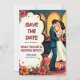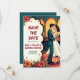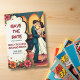 Den här eleganten, tecknad bok-stil, sparar du datumet då inbjudan är perfekt för ett modernt bröllop. Den reflekterande utformningen har en illustration av vintagens brud och groom och svartfärgad kalligrafi på en tecknad med bok som tema.