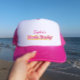 En docktemaserad "Bach-fest"-design med rosa och gula färger. Brudens namn står ovanför i ett retro-typografi. Detta kan vara ett roligt tillägg för brudtärnor att bära på en möhippa.