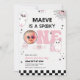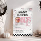 Retro Rosa Black Spooky Ett första födelsemeddelande för Flicka Halloween-skådespel Ett första födelserbjudande för ett flicka som innehåller två groovy spöken, ett kubiknät, spindlar, stjärnor, en söt shull och text i svart och orange. Den här första födelsedagsinbjudan innehåller också ett schackbräde mönster och är idealisk för en första födelsedagsfest i oktober för ett flicka.