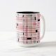 Detta Retro Rosa Grid och Starburger Two Tone Coffee Mugg är där vintage stil möter modern tid. Den har en ljus rosa bakgrund med kitschy, off kilter-kvadrater och rektanglar i dove grått och tre skuggor av rosa. De visuella blocken i färg är överlagrade och sammanfogade i några av rutnätsskärningspunkterna. Det finns också svarta rektanglar där svart lodrät och vågrät linjer bildar ett rutnät mönster. Svart stjärndesigner och svarta fyrkanter placeras sporadiskt under detta halvsekels moderna tapesektor i färg. Den här designen har de vanligaste rosa-färgerna i vintagens badrum. Ta av dig dina fallskärmar och klockor-grund och njut av det här till 1960-talet.