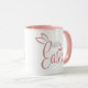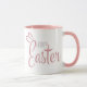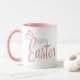 Detta helt enkelt berömvärda tvåtonade Påsk mugg säger Glad påsk i ett pastellskript och ett blått rosa med ett sött par kanin öron ovanpå "E" i Påsk.