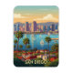 Step back in time with this captivating vintage travel art print featuring the iconic San Diego skyline. This unique piece captures the serene beauty of the California coast, showcasing sailboats gracefully navigating the harbor amidst towering palm trees and classic architecture. Perfect for adding a touch of nostalgic charm to a living room, office, or as a thoughtful gift for travel enthusiasts and lovers of Californian history. Embrace the timeless allure of America's Finest City with this retro-inspired artwork.
